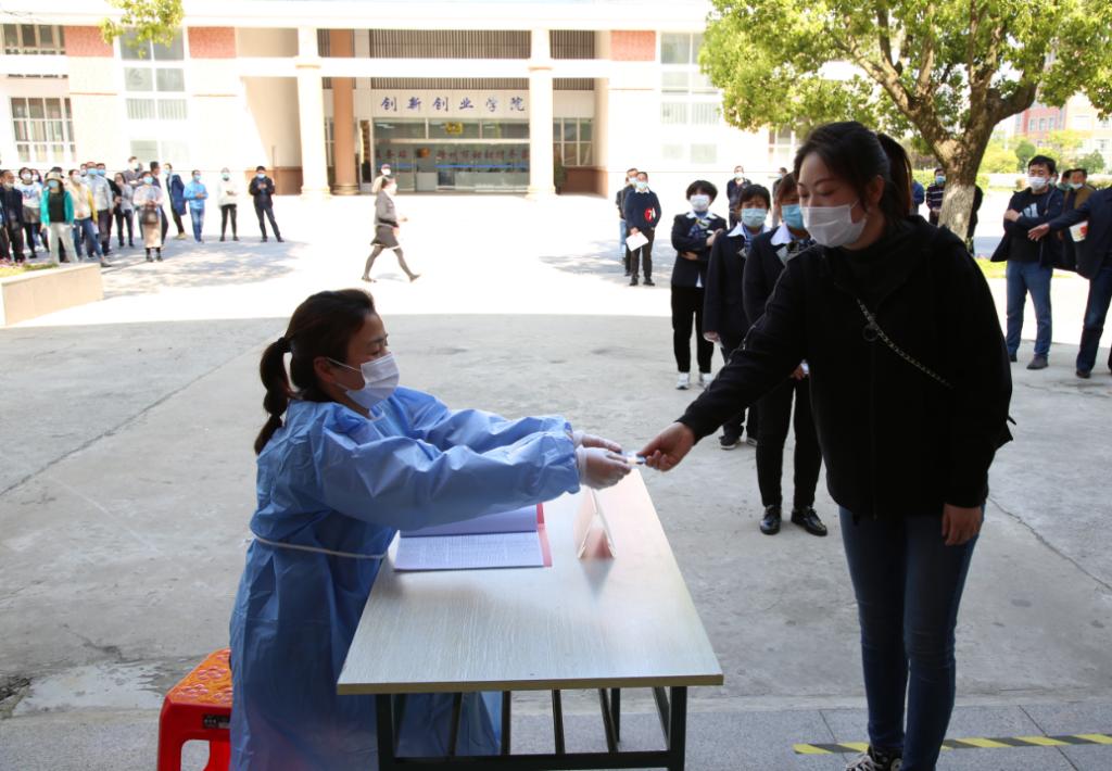 返校学生在志愿者引导下,来到本人所在教学院部报到点接待通道,间隔1米有序排队,并刷卡(身份证)报到、进行个人行程轨迹等相关信息登记,提交提前填写好的个人基本健康档案、承诺书后,领取报到凭证。对于人行程轨迹有与感染接触的同学,进行留置观察,对体温异常情况(≥36.8℃)的同学,进行应急隔离处置。