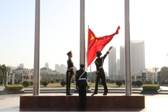 国旗护卫队踏着整齐有力的步伐,伴着雄壮的国歌声响起,五星红旗徐徐上升,全体人员注目行礼。