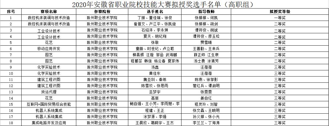2020年安徽省职业院校技能大赛受疫情影响,在赛项设置、规程、数量等方面变化较大。接到比赛任务后,校领导高度重视,校实训中心及各教学院部认真组织,各参赛团队刻苦训练、顽强拼搏,经过激烈的竞争,金沙威尼斯共荣获一等奖1项、二等奖7项、三等奖10项。