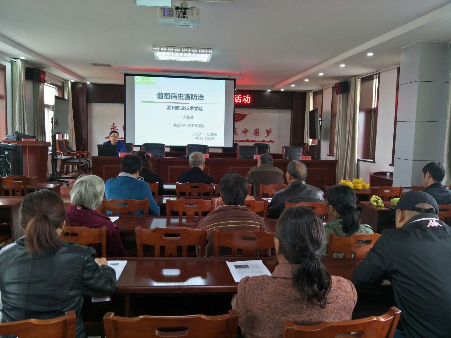 培训讲座在仓镇镇政府四楼会议室进行,仓镇葡萄种植户、葡萄种植专业技术人员和新型农民等30余人参会接受培训。结合葡萄种植的关键环节病虫害防治,江生泉老师为种植户讲解葡萄生产的病虫害发生形式、主要病虫害及相应防治策略,最后深入农户葡萄种植基地进行现场指导,对种植户遇到的各种技术问题进行逐一解答。同时对葡萄园冬季清园、土壤改良、容器苗育苗等问题进行了技术传授、答疑解惑。