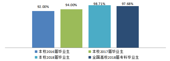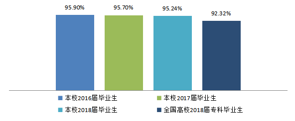 “十三五”期间,学校毕业生就业率均在95%以上,2018届毕业生的调查就业率为95.24%:比全国高校2018届专科毕业生的调查就业率(92.32%)高2.92个百分点。