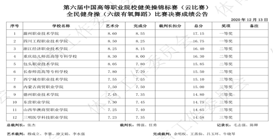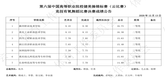 12月12-13日,由中国大学生体育协会主办、中国大学生体育协会职业教育学校体育工作委员会执行、浙江经济职业技术学院承办的第六届中国高等职业院校健美操锦标赛(云比赛)决赛通过腾讯直播的方式线上举行。金沙威尼斯健美操队发挥出色,斩获两金一银一铜的佳绩,比赛成绩位列全国所有参赛学校前列。