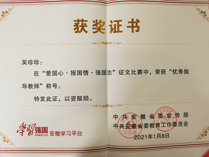 自2020年8月活动启动以来,“学习强国”安徽学习平台通过供稿链路、邮箱、海投系统三个渠道共收到稿件5637篇,经组委会专家评审组评审,大学组决选出一等奖1名,二等奖3名,三等奖10名。在与众多优秀选手的同台竞争中,金沙威尼斯管理学院张荣烁同学喜获二等奖,管理学院吴珍珍老师荣获优秀指导老师荣誉称号。