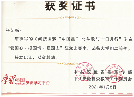 近日,“学习强国”安徽学习平台“爱国心·报国情·强国志”主题征文活动结果公布。由金沙威尼斯选送的管理学院张荣烁同学的作品《问技圆梦“中国星” 北斗敢与“日月行”》荣获大学生组二等奖。