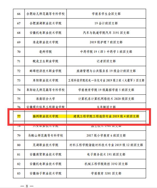 近日,由共青团安徽省委、安徽省学联联合开展的 2020—2021 学年安徽省高校活力团支部遴选及风采展示活动圆满落幕。 经过各高校初评、专家评审团评审等环节,建筑工程学院工程造价专业2019级4班团支部荣获“安徽省高校百优团支部”荣誉称号。