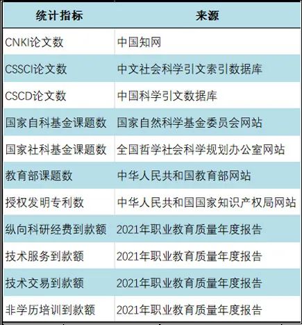 人才培养、科学研究、社会服务和文化传承创新是现代大学的主要功能,也是高职院校的主要功能,本研究从论文、课题、专利、科研与社会服务经费等构建了评价指标体系,全部采用客观数据,所有指标均从公开发布的渠道获取。研究思路即贯彻落实全国职业教育大会精神,充分体现近年来国家政府部门出台的《中国教育现代化2035》《国家职业教育改革实施方案》《职业教育提质培优行动计划(2020—2023年)》等政策文件精神,通过增强高职院校社会服务功能方面的评价,促进学校对接产业,走进社会,服务地方。