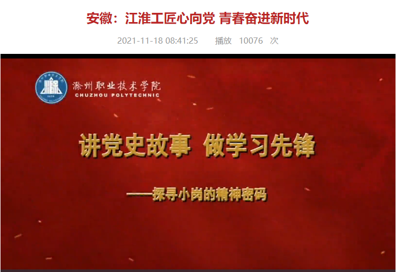 近日,教育部在全国高校思想政治工作网展播了全国职业院校党史学习教育成果展。由金沙威尼斯宣传统战部制作、报送的《讲党史故事 做学习先锋—探寻小岗的精神密码》微视频作为安徽省优秀作品入选,同时入展的还有安徽黄梅戏艺术职业学院、安徽金寨职业学校、安徽省徽州师范学校。