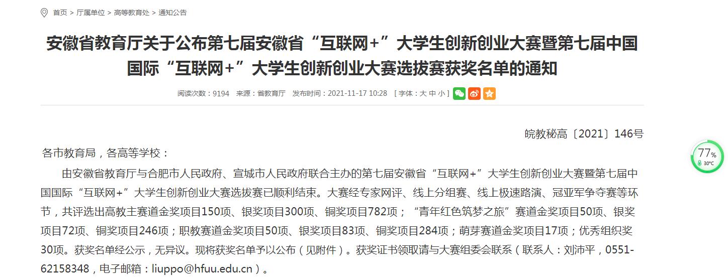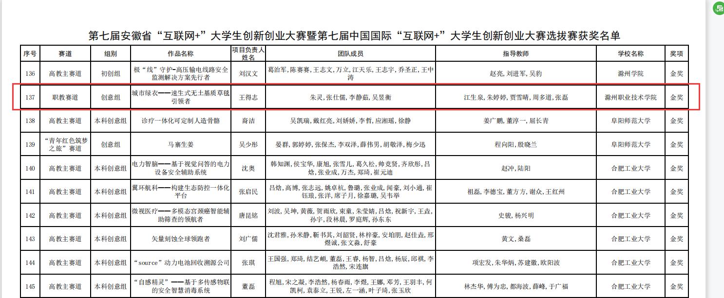 中国“互联网+”大学生创新创业大赛是李克强总理亲自提议创办的全国性赛事,是深化创新创业教育改革的重要载体和关键平台,大赛有力促进了科技成果转化与产学研深度融合,营造了协同培养创新创业人才的良好生态,推动了高校毕业生更高质量创业就业。今年第七届中国“互联网+”大学生创新创业大赛共有来自国内外121个国家和地区、4347所院校的228万余个项目、956万余人次报名参赛,其中职教赛道共计2116所院、86万余个项目、330万余人次报名参赛,安徽省入围职教赛道国赛仅20个项目。本次大赛成绩的取得也说明金沙威尼斯“课程嵌入,专创融合”的教学模式已初显成效。