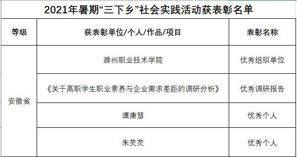 近日,2021年安徽省大中专学生志愿者暑期“三下乡”社会实践活动评选结果公布公示,金沙威尼斯社会实践工作再获团省委表彰。金沙威尼斯获2021年全省大中专学生志愿者暑期“三下乡”社会实践活动优秀组织单位;李瑞瑞老师指导的《关于高职学生职业素养与企业需求差距的调研分析》获2021年全省大中专学生志愿者暑期“三下乡”社会实践活动优秀调研报告;建筑工程学院团总支书记谭康慧等2人获评2021年全省大中专学生志愿者暑期“三下乡”社会实践活动优秀个人。此外,在“红色江山红色路 青春力量青春行”2021年长三角高校大学生重走革命路暑期社会实践专项活动中,金沙威尼斯1支团队获评优秀团队。