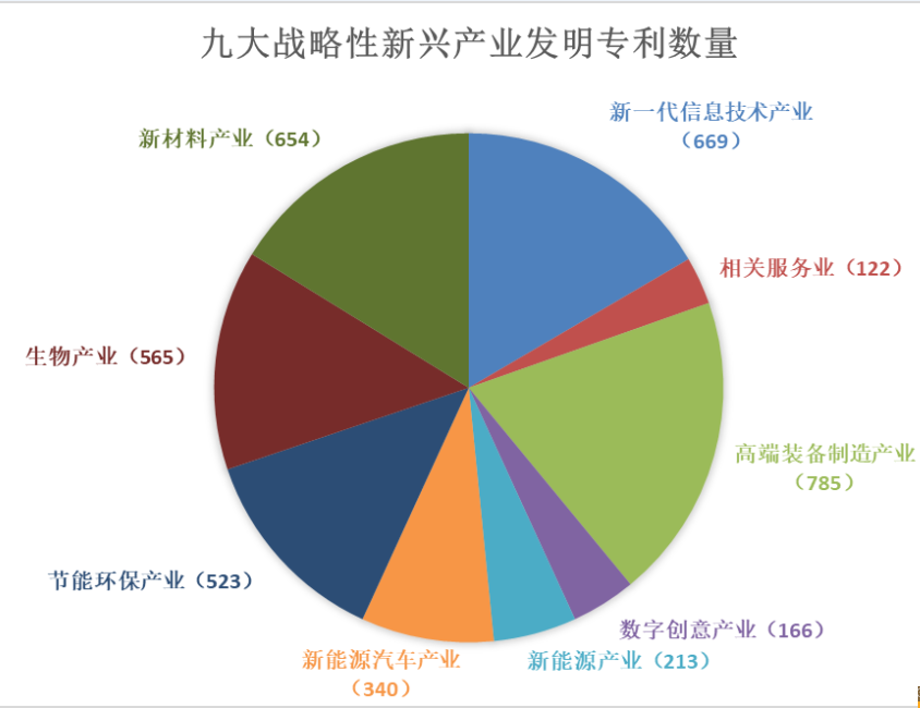 战略性新兴产业是指以重大技术突破和重大发展需求为基础,对经济社会全局和长远发展具有重大引领带动作用,成长潜力巨大的产业。它既代表着科技创新的方向,也代表着产业发展的方向,具有科技含量高、市场潜力大、带动能力强及综合效益好等特征。因此,对战略性新兴产业类发明专利数据进行专项统计和分析具有重要意义。从战略性产业的分类看,发明专利授权数量布局分别是高端装备制造产业、新一代信息技术产业、新材料产业、数字创意产业和相关服务业(详见下图)。