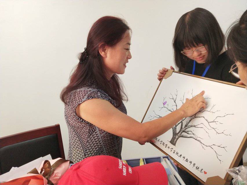 节日当天,同学们带着笑容早早来到老师们的办公室,亲手为老师们送上康乃馨和节日的问候,只为在这感恩的教师节里为敬爱的老师献上真诚的祝福:“老师,您辛苦了!”。此外,同学们还绘制了指纹树,老师们一个接着一个的指纹填满树枝,形成了坚实的树冠,表达了同学们对老师浓浓的谢意。一句句简单问候,把老师的幸福感装得满满的。