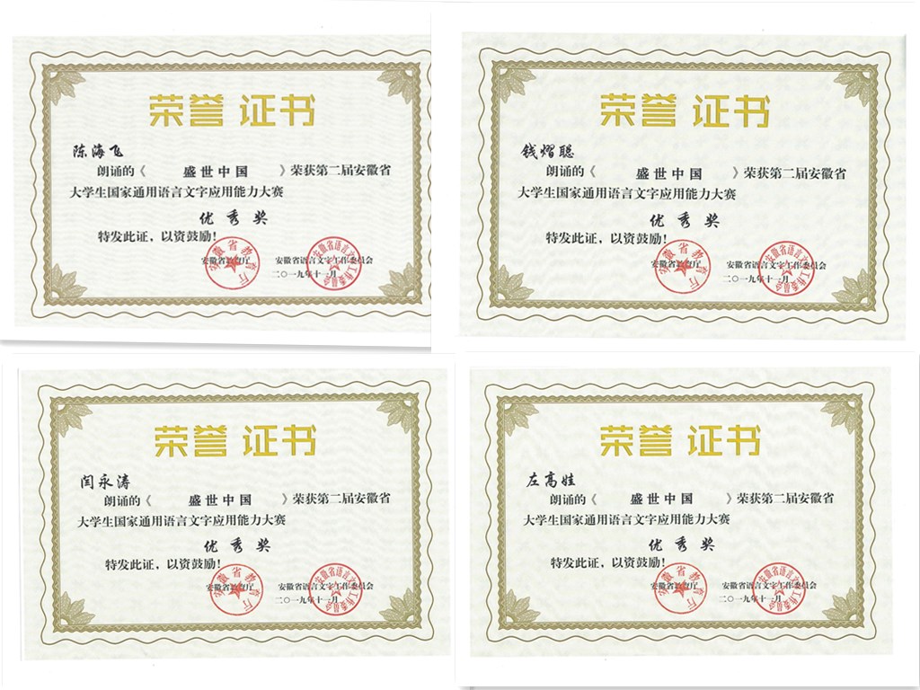 由安徽省教育厅、安徽省语言文字工作委员会主办,合肥工业大学承办的第二届安徽省大学生国家通用语言文字应用能力大赛在合肥工业大学隆重举行。金沙威尼斯左高娃、陈海飞、钱熠聪、闫永涛同学的朗诵作品《盛世中国》获得优秀奖。