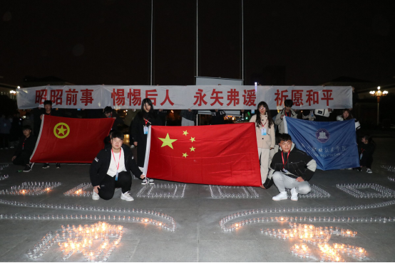 学生代表胡誉上台致公祭词,活动现场摆放成“300000”“南京”“12.13”字样,全体人员手捧蜡烛为在南京大屠杀中的死难者和所有在抗战中壮烈牺牲的抗战先烈默哀三分钟。签名仪式上,大家纷纷在横幅上签下自己的姓名。最后,参加此次活动的同学们在南阶205,观看缅怀先烈的电影《南京!南京!》。影片以非常真实的镜头语言,再现了那段滴血的历史,让每一个看过的人记住南京大屠杀事件对国家造成的伤害。