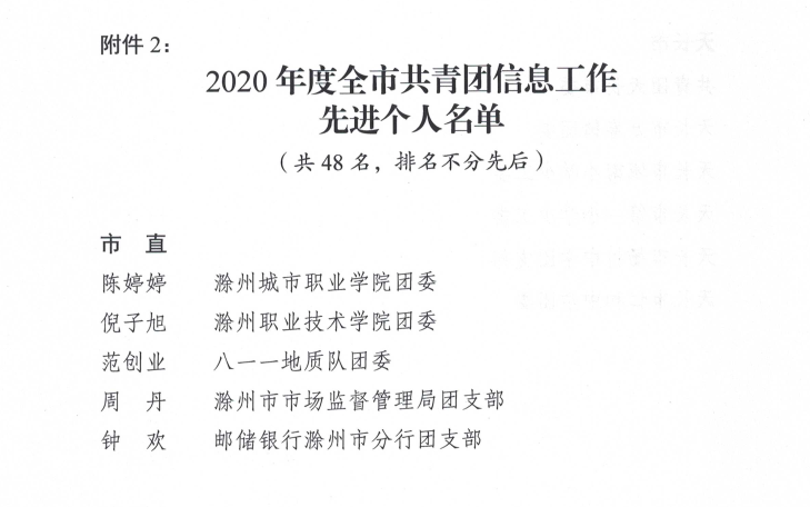为树立典型,进一步提高各级团组织和广大团干部信息工作水平,共青团滁州市委于近日发布《关于2020年度全市共青团信息工作先进集体和先进个人的通报》,金沙威尼斯倪子旭老师被授予“2020年度全市共青团信息工作先进集个人”荣誉称号。