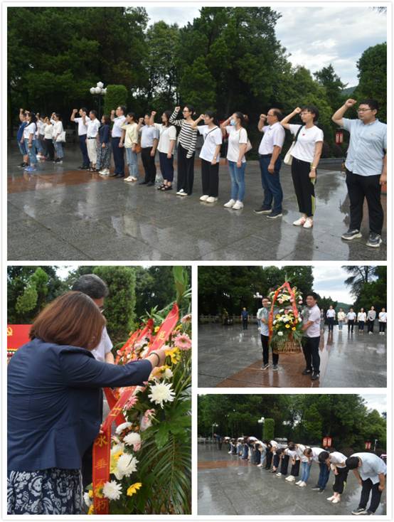 松柏青青,党旗艳艳。瓢泼大雨也不能阻止大家瞻仰革命先烈的步伐。在镌刻“燎原星火”的烈士纪念塔前,全体党员整齐列队,神情肃穆,怀着无比崇敬的心情向革命先烈鞠躬默哀、敬献花篮,表达对革命先烈的深切哀思和崇高敬意。面向鲜红的党旗,党员们重温了入党誓词,表达继承先烈遗志、砥励奋斗前行的坚定决心。